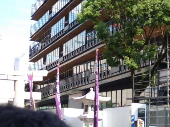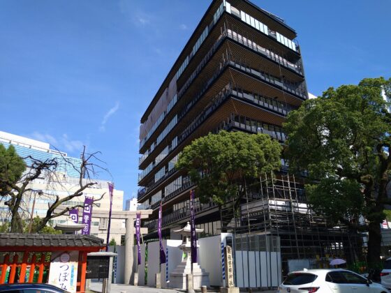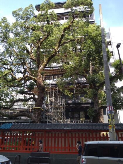 警固神社。周りは商業施設が立ち並ぶ天神界隈ど真ん中の境内にビル建設中だった。社務所移転かな?