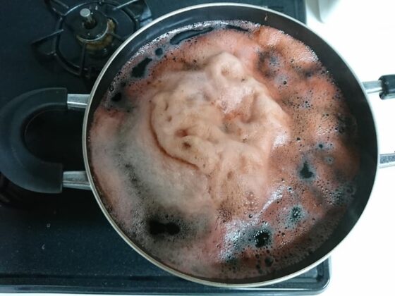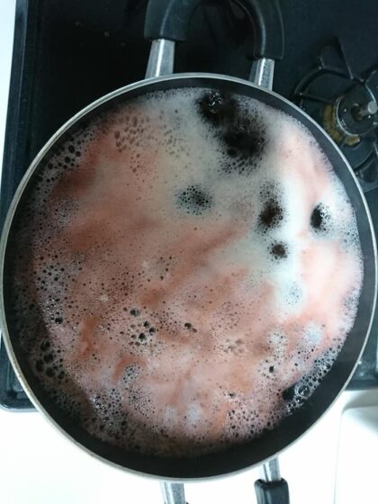 ⑬⑫後、水を捨てて、新しい水で砂糖を約800グラム入れて煮ます。途中で灰汁を取ります。