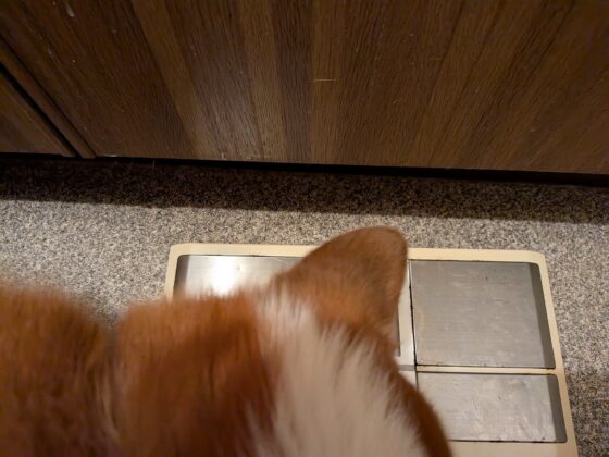 写真は朝の体重測定しようとして毎度コギ犬ビバに邪魔されるの図